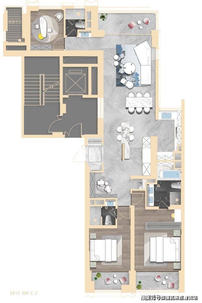 其中2#为超高层,北向可观小区绿化和苏河景观,高区可瞰三件套盛景。