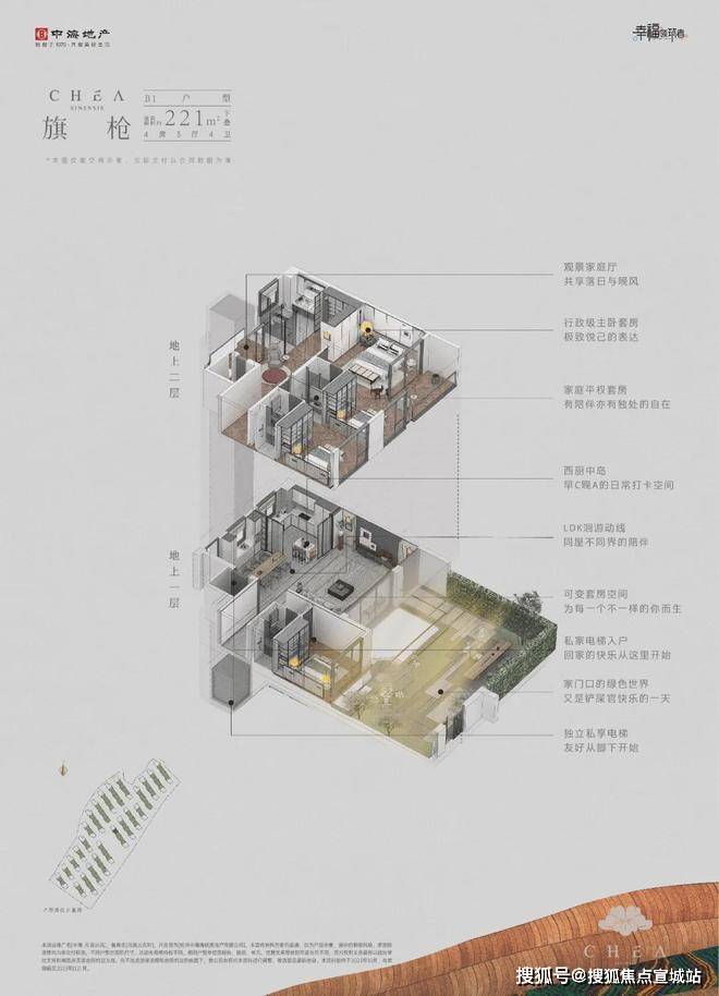 以建面约210㎡的上叠“云雾”和建面约221㎡的下叠“旗枪”为例。月陇云岚解决了很多叠院上下叠共用电梯这个痛点,在这个项目里,所有的户型都是私梯入户的。下叠入户口在南向花园,上叠在一楼也有北向私梯入户花园空间。
