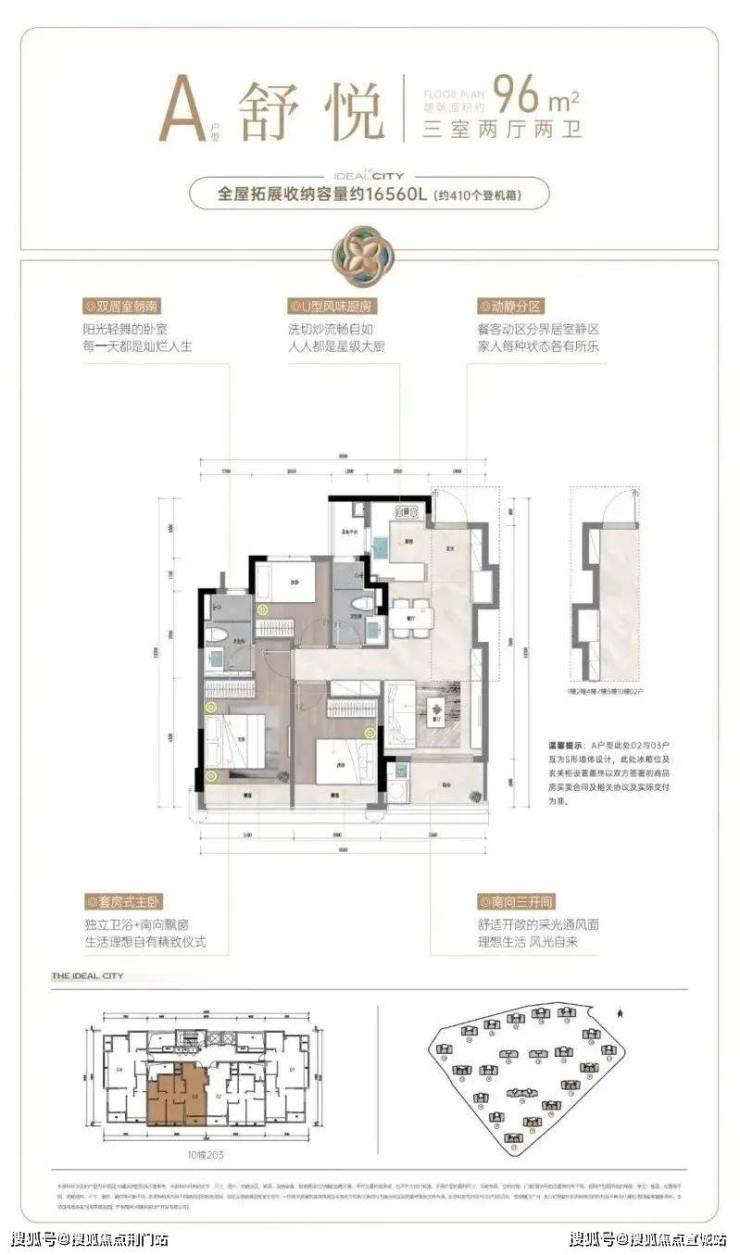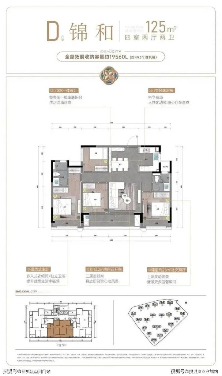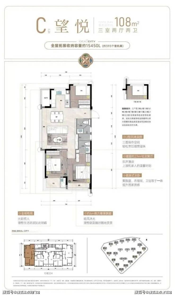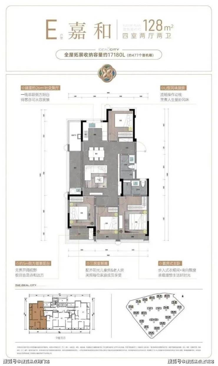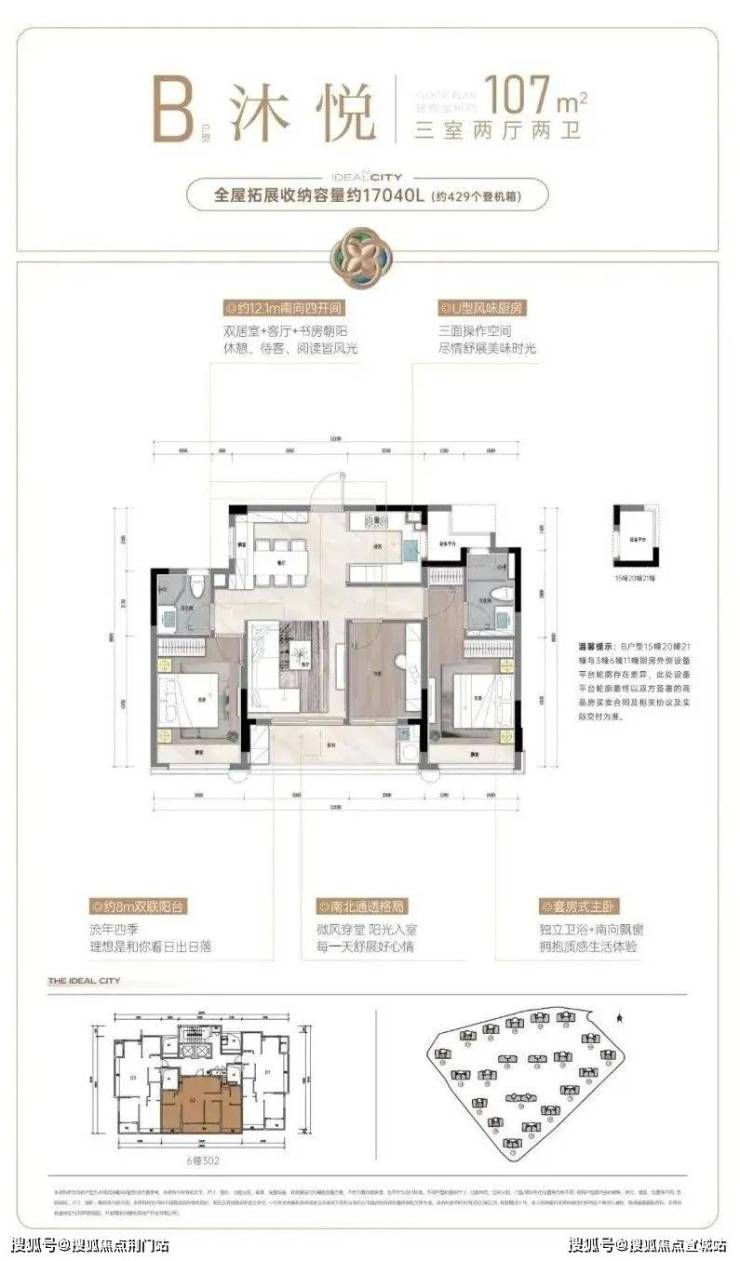 建面约107㎡户型,则把重点放在舒适度上。阔绰方厅+双联阳台,通风赏景至佳,还有U型厨房,三面操作空间,动线流畅好用;套房式主卧更配置了步入式衣帽间,独立卫浴设计,保证了主人家的隐私和仪式感。