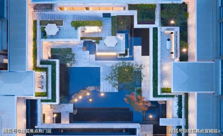 下沉庭院采用大面积静水面结合造型树的方式打造,同时局部设置叠级分台的方式增加空间的层次。