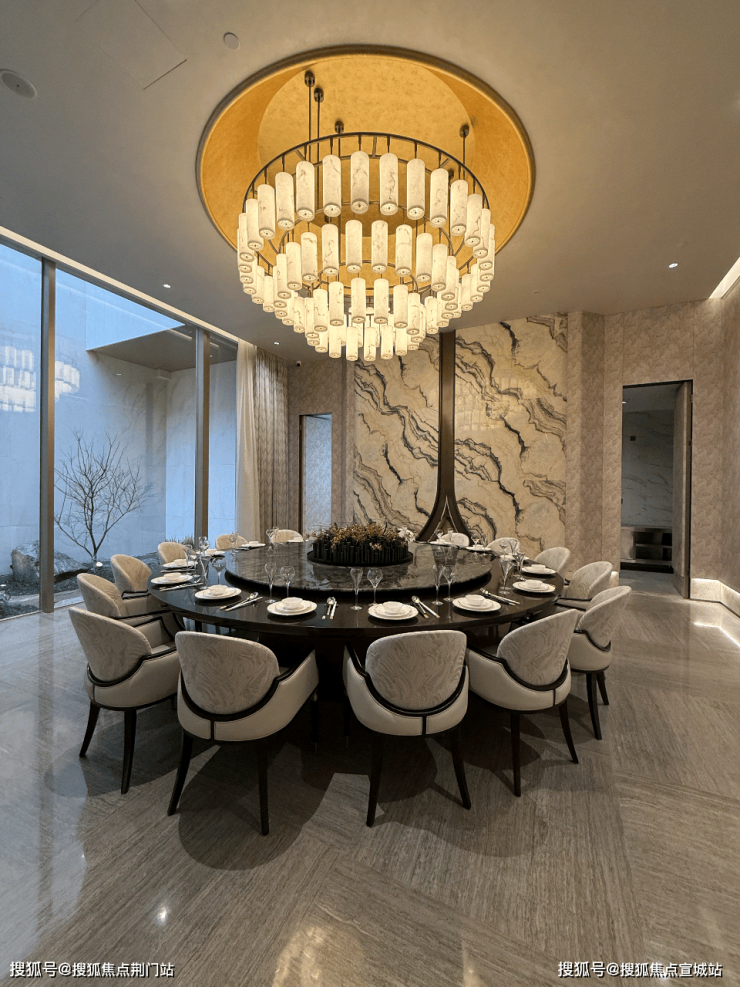 进入大门之后的庭院,用11根约5.3米高的弧形柱子,环绕拉升起了一个巨大的藻井空间,吊顶大手笔用了透光云石,柱顶嵌入了奢石;正中央更是种下了一株百年古桂树,冠幅有约7.6米,树高有约7米,一眼望去仿佛撑满了整片藻井天幕。