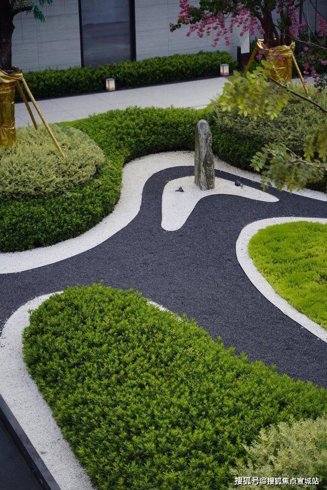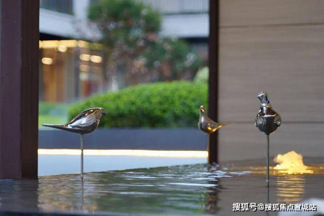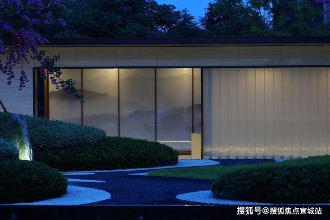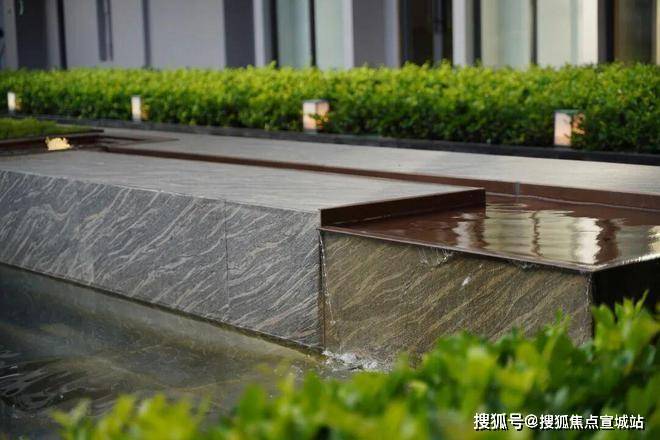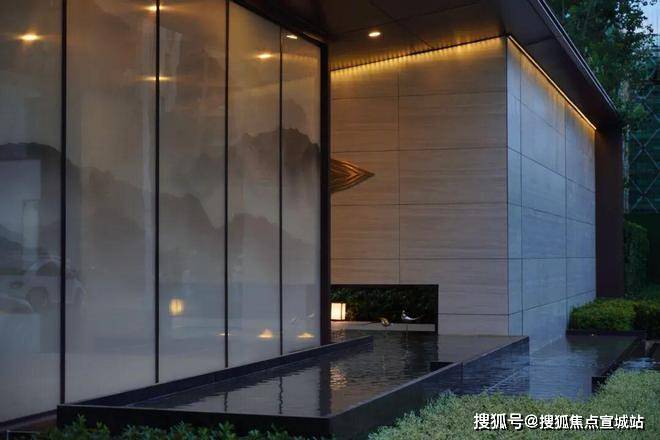 规则的绿植、层叠的水景营造入口空间体块感的同时也消除了门廊和围墙的生硬感,结合灯光、小品,为空间注入一抹灵动与温暖。
