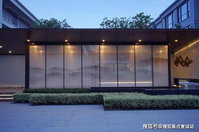 门廊以虚实相间的形体划分入口空间,山水画卷屏风营造入口仪式感,玻璃景墙与内庭的自然景观光影交织,隐约可窥内庭,半遮半掩却又不失端庄。
