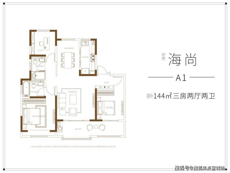 目前开盘的1号楼均为144㎡户型,只做了3房2厅2卫,超大的双联阳台,尺度感拉满。