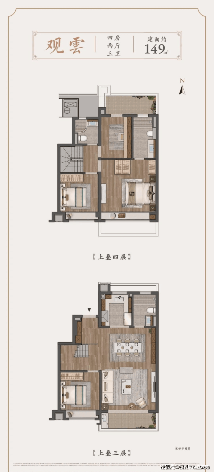 户型:有建面约 93-180㎡宽境高层,建面约 149-175㎡低密院墅。其中,高层有建面约 93㎡的 3 房 2 厅 2 卫、99㎡的 3 房 2 厅 2 卫等户型;叠墅有上叠建面约 149㎡、175㎡的 4 房户型,下叠建面约 162㎡的 4 房户型。