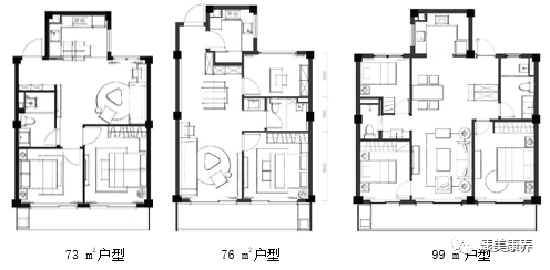 2居73 m2 采用双南卧设计;76 m2户型采用南北卧、南客厅布局形式。3居户型99 m2和109 m2采用三室两厅一卫的格局,125 m2采用三室两厅两卫格局,99采用南向三开间设计,109 m2和125 m2均采用南向双开间,边厅设计。全部户型采用适老化设计。