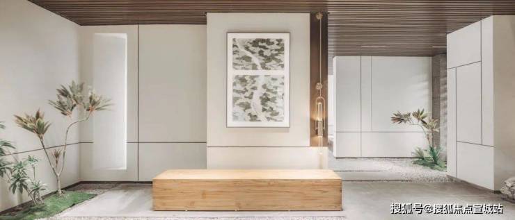 地上入户大堂采用中式经典构图方法——框景,打造未进门,先见景的效果。中国人一直讲究,生活中处处有景。框景的工艺就是能做到从任何一个框望过去都是景色,角度不同景色也不同,一步一景的效果。