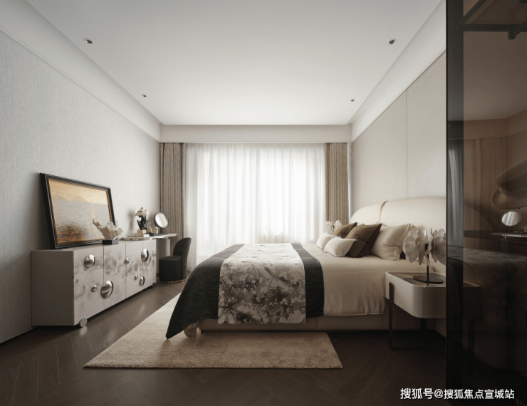 客厅面宽达到约4.2m,空间感和舒适度拉高了一个档次。项目还创新性采用"岩板隐形门"设计,将次卧入口完美融入电视背景墙,呈现极简主义的空间美学。