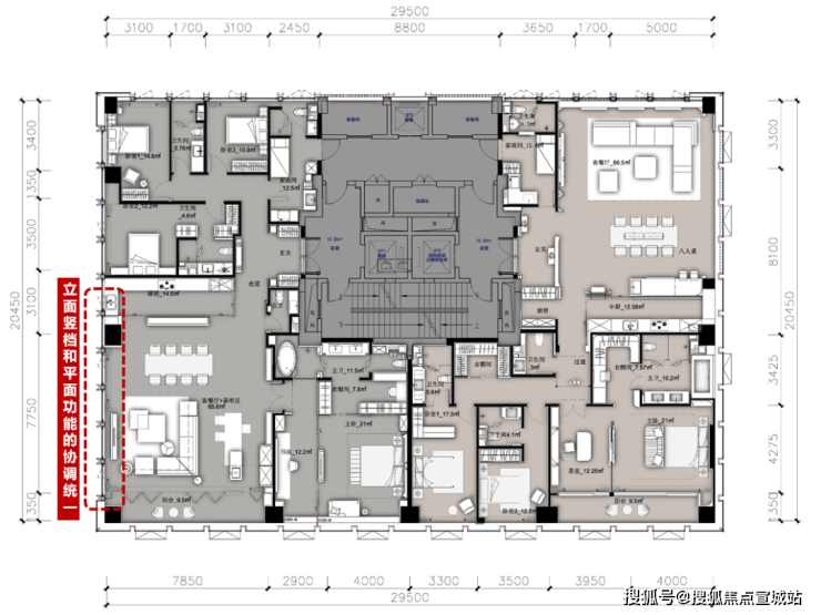 建筑设计:特邀“CREDAWARD地产设计大奖”得主SEA东南担纲设计,结合项目的地块价值和产品迭代的定位,立面采用灰色大面积玻璃幕墙加铝板设计,通过大尺度的窗墙比,营造270°的巨幕景观视野和空间采光体验。