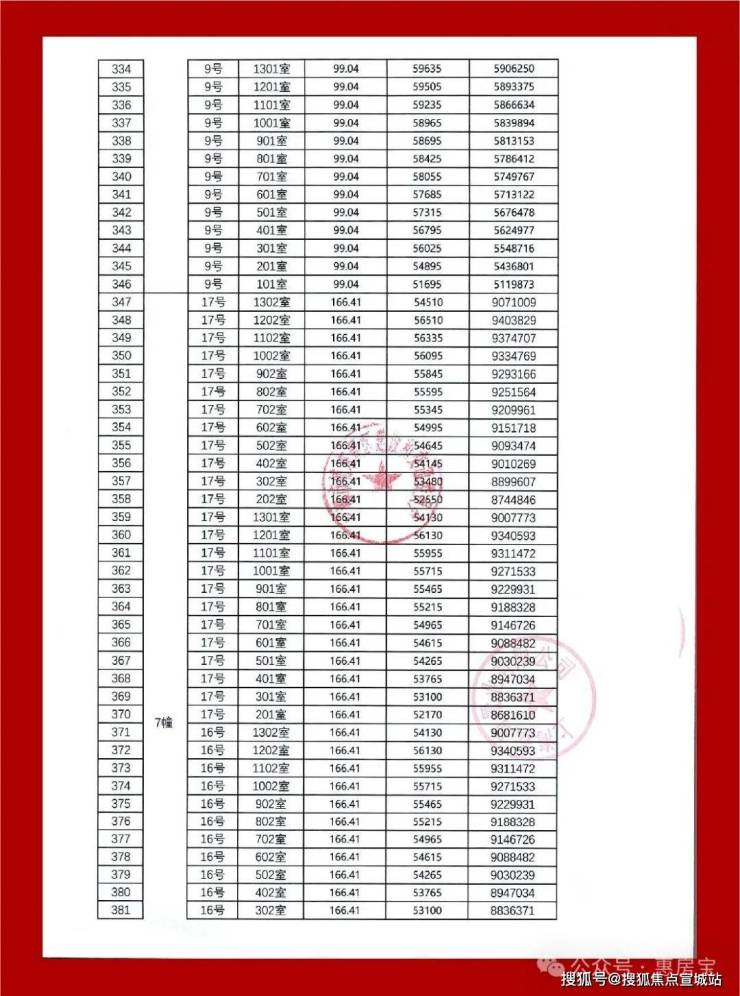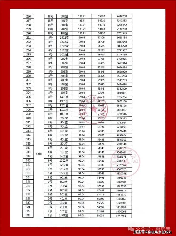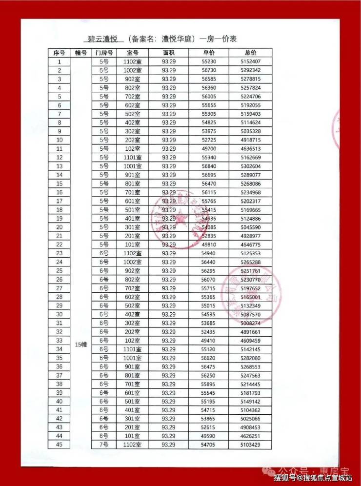 一房一价表如下