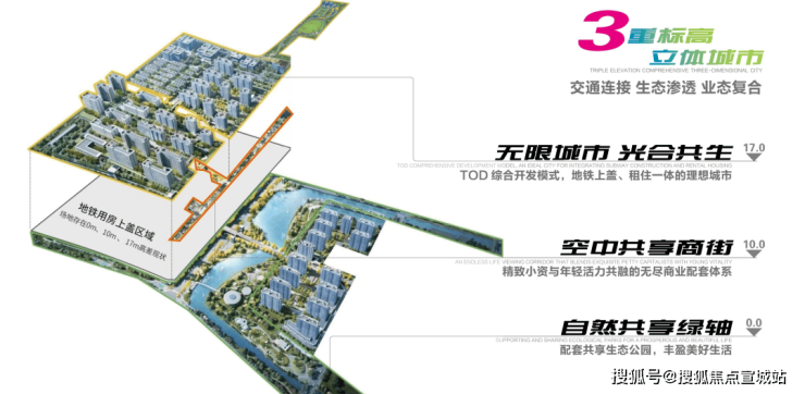 二度标高10m:配有生活服务配套,商业、公园、办公。1万㎡精致生活配套、盖上商业文化、体育文化、养老医疗、行政管理健康四轴。