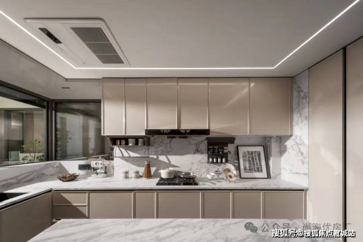 超大尺度的中西岛台 ,既符合中式烹饪的实用逻辑(预留足够操作台面),又能承载西式社交(朋友小聚时在岛台品酒聊天),让厨房从“单一做饭空间”变成“生活场景发生器”。