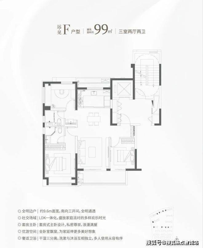 F户型:远·见建筑面积约101㎡,三房两厅两卫