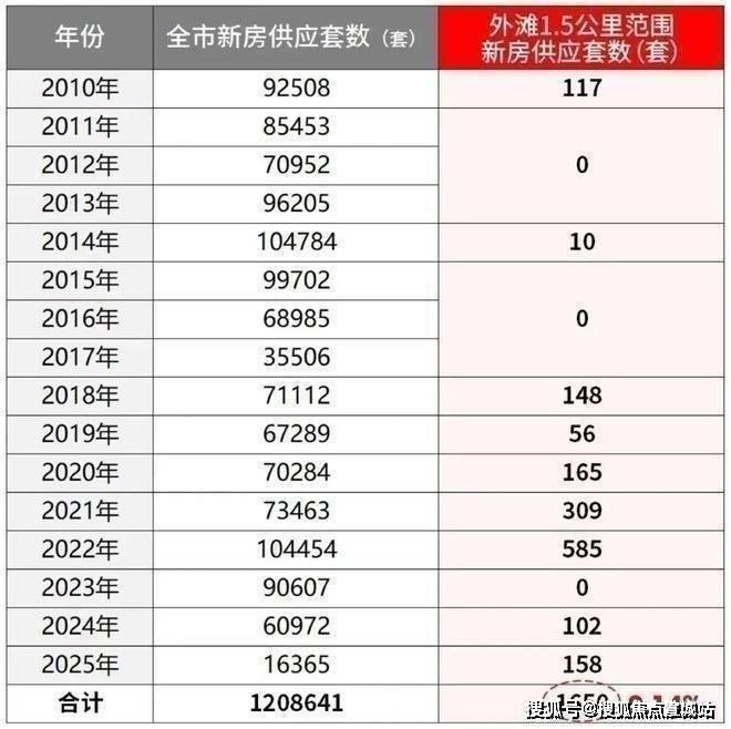 据小编统计,自2010年至今,外滩1.5公里核心圈内仅供应1650套新房,占全市新房总量比例低至约0.14%。
