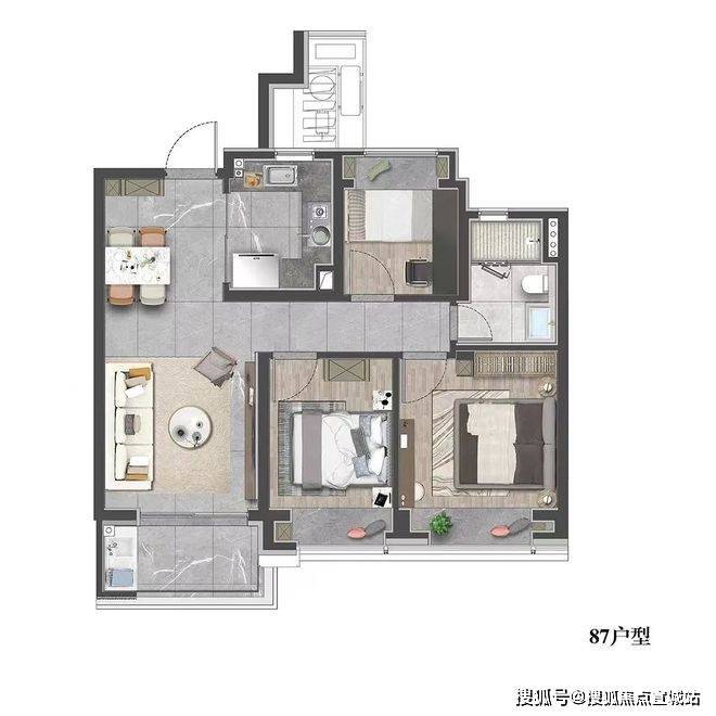 该户型贴合当代人居生活习惯,既适合三口之家小太阳家庭,也可以是三代同堂,每个人都能拥有独立空间。