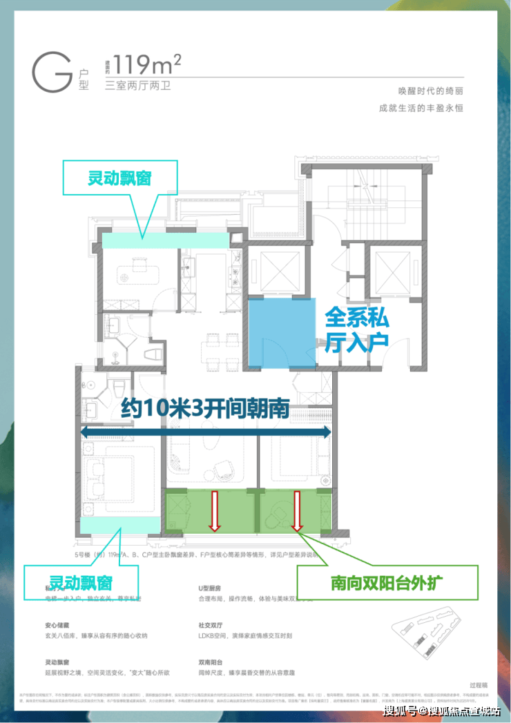 配合“多阳台半赠送”等空间策略,实现了令人惊叹的约94%超高实得率(119㎡亦达约91%)。