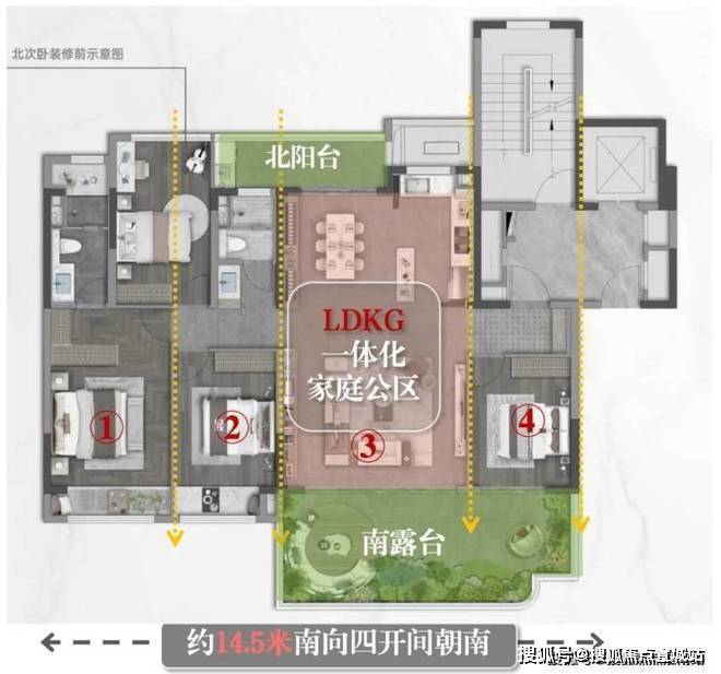 南向约14.5m超大面宽,三卧朝南布局,这一面除了必须的墙体,都是玻璃和露台,采光面史诗级!
