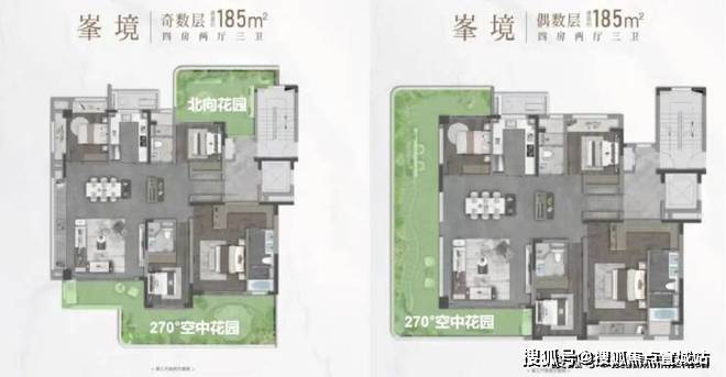 奇数层户型则分为南北两个花园,功能区隔更加明显:南向花园与主卧相连,生活动线更加丰富.