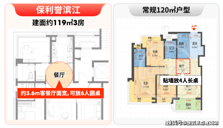 建面约119㎡户型,客餐厅面宽达约3.6米,区别于常规户型只能贴墙放4人长桌的局促,这里可从容摆放6人圆桌,逢年过节全家聚餐,再也不用“挤着吃饭”;