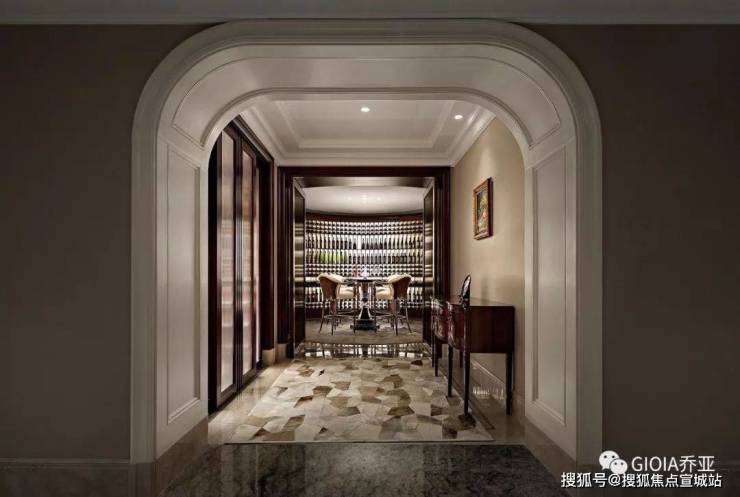初入圆厅,承转起合,步步尊贵,形成各具特色的框景。沿袭460年帕拉迪奥“十字圆厅”礼序,完美融合西方建筑尺度与东方设计美学,升华尘世生活的尊荣和仪式之美。一方精美绝伦的图腾拼花席地绽放,独具摩登与艺术魅力,提升空间纵深感的同时,尽显天然石材的柔美流畅。