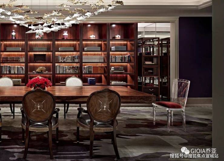 藏书阁位于沙龙中心北侧,是古典法式和现代轻奢的唯美邂逅。深色的巴西酸枝木作基底,融合了色彩柔和的漆面,厚重的羊毛地毯搭配雍容的丝绒沙发,褐色皮质家具与点缀其中的中式元素,使空间不失底蕴,又略显俏皮。