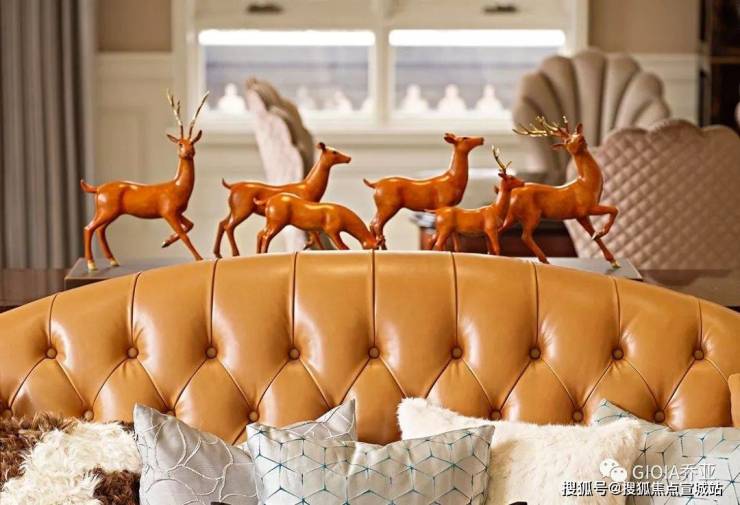法式沙发的精美雕花加上贴金描银的点缀,舒适柔软的皮质,华丽细腻的丝绸,宫廷典雅溢于言表。搭配边柜上姿态昂扬,气势非凡的麋鹿群,浓浓的自然主义优雅气度扑面而来。