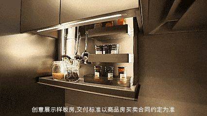 •电动调味舱(建面约143㎡户型):隐藏调味品易拿取,保持台面整洁;