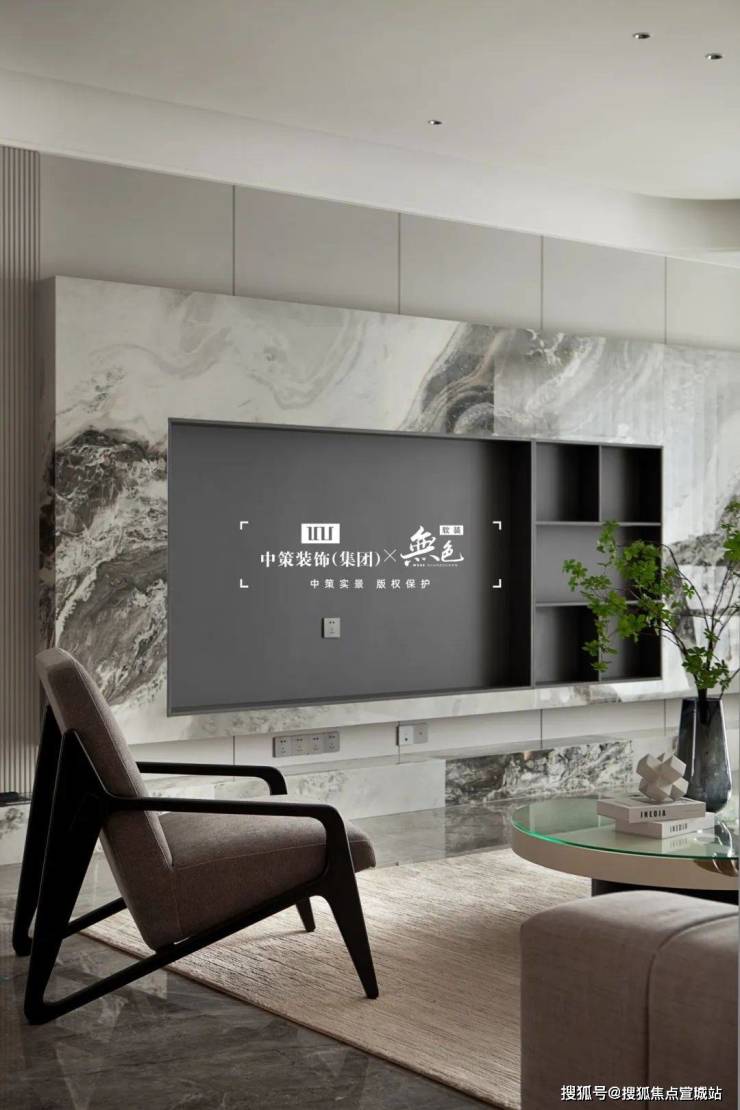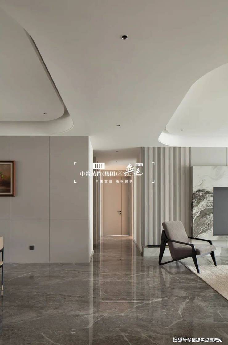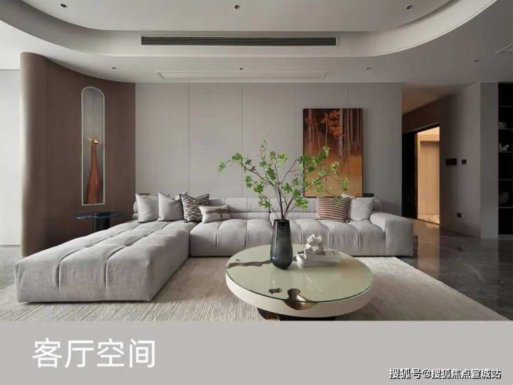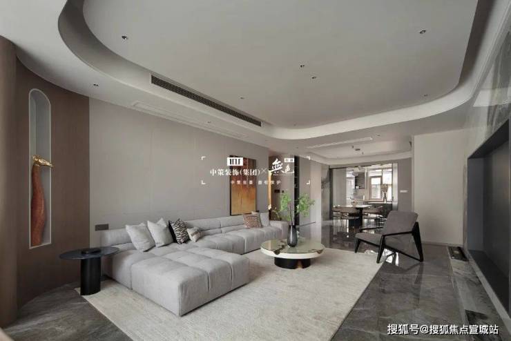 客厅右侧的弧角采用墙板设计,在局部视线上可隐藏后方的柜体,保持客厅的整洁感。