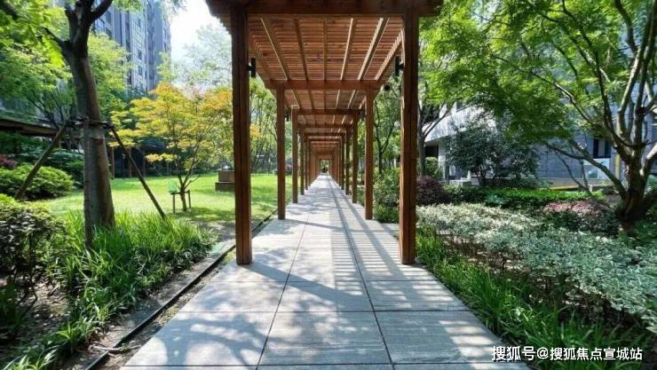 映月亭台、枫林广场、曲径散步道、南北花廊,这四大主题空间共同构成了一个具有“度假感”的社区核心。