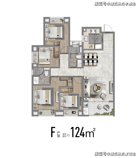 建面约124m²四房,市面常见的四房普遍要135平,这个约124平米户型功能性拉满,且控制了总价,给予更多小伙伴一步到位的机会.