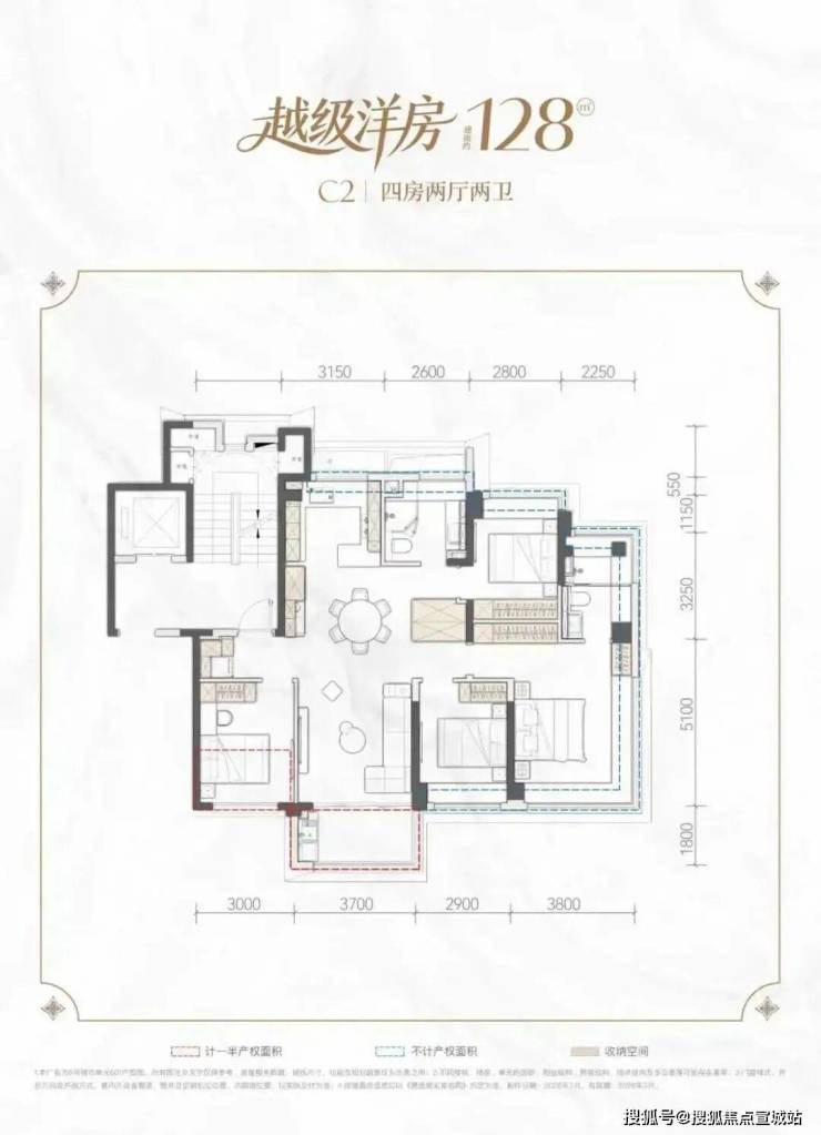 建面约128㎡四房,实得率89%-95%——空间感媲美147㎡产品。