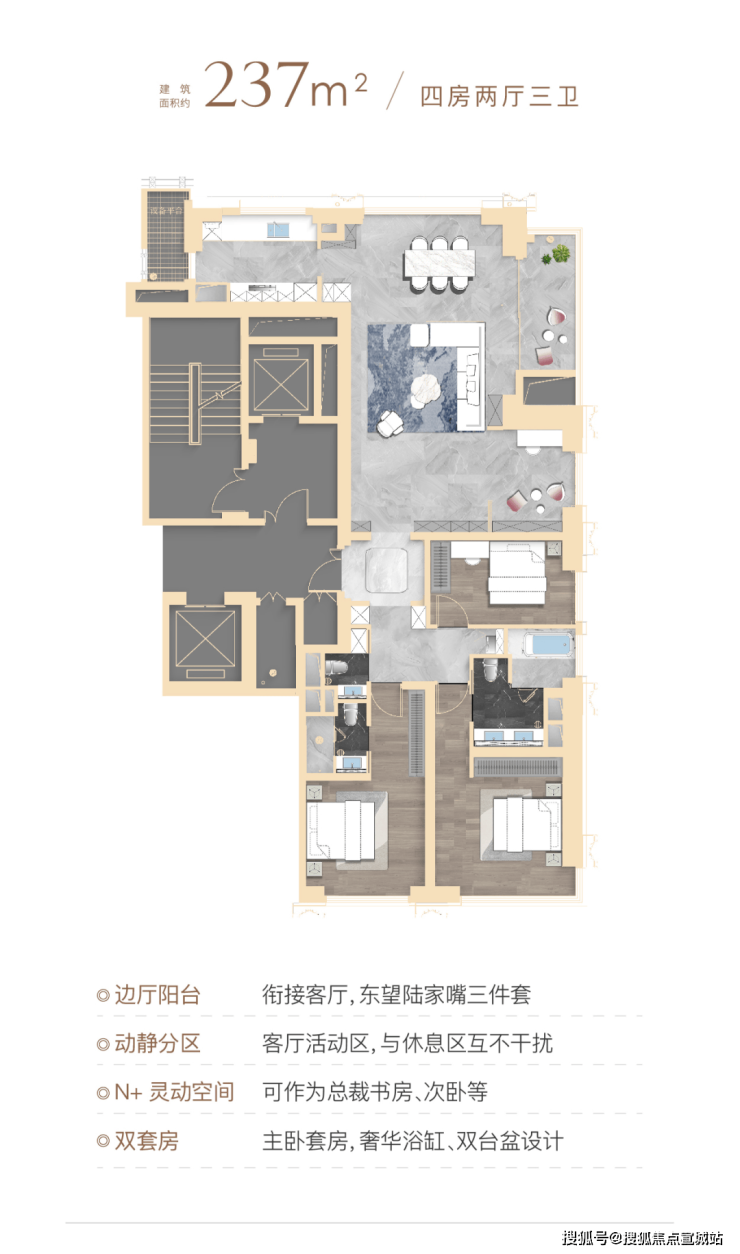 顶豪社交空间格局,普遍只有餐厅、客厅和阳台,该户型在南侧配置了一个家庭厅着实巧妙,可以是业主的茶室,也可以是女主人的手工室,当然也可作为X空间,随家庭结构和需求随心定制,书房、学习区、游戏区,女王化妆间等皆可。
