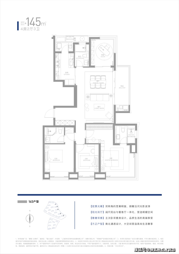 约145㎡四房两厅三卫:大横厅搭配270°景观视野,套数不多,改善置业必抢。