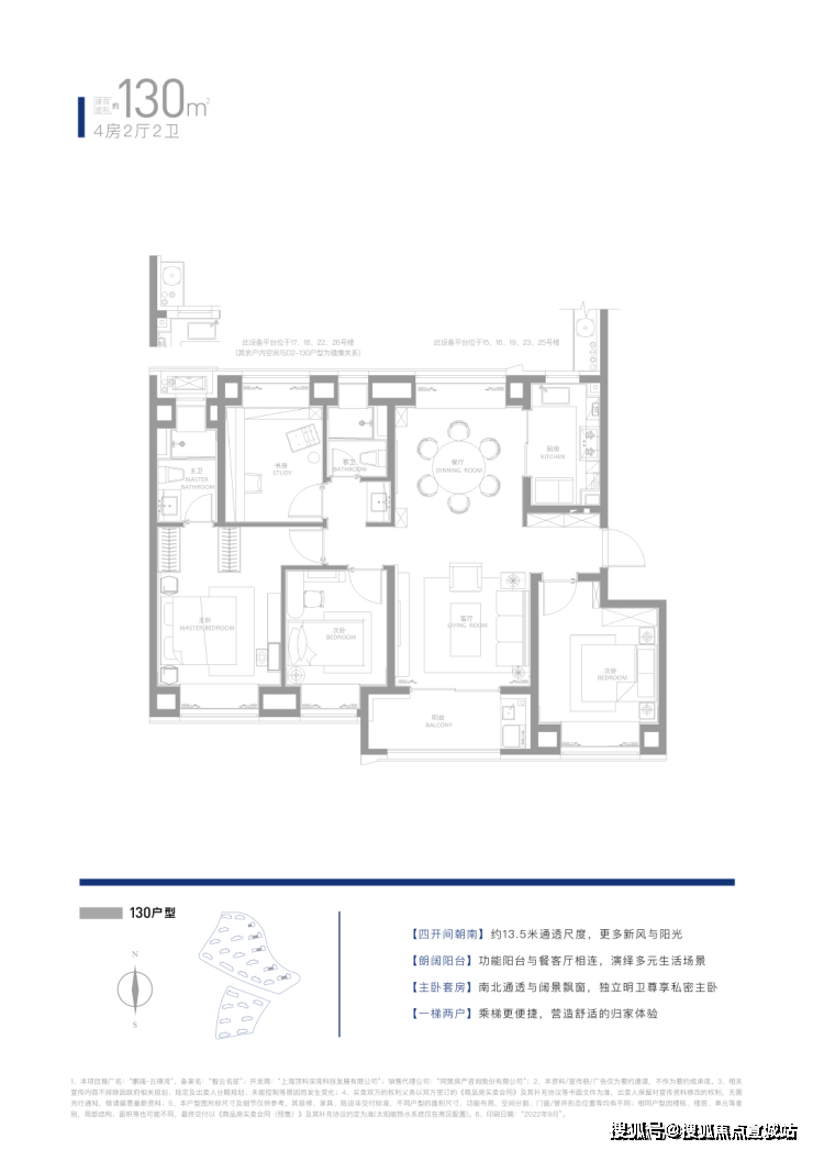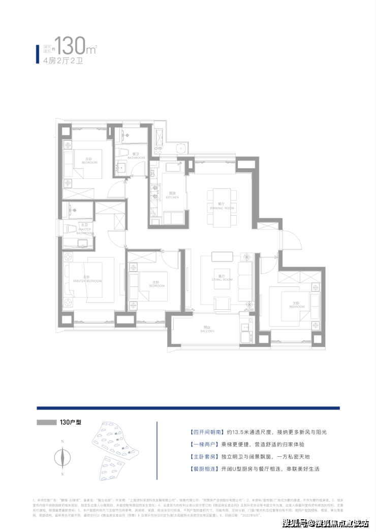约130㎡四房两厅两卫:一梯两户设计,约13.5米整体面宽,景观视野开阔。
