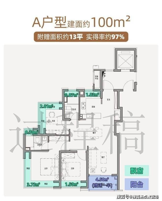 经专业测算,A户型全屋赠送面积高达13㎡,实得率约97%。