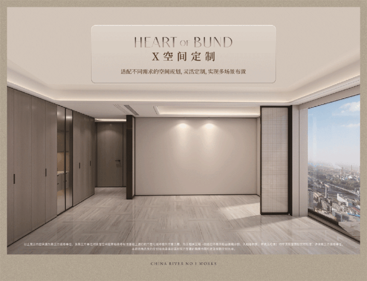 环幕江景舱:以270°无界平层结构,配合3.3米层高(部分)和全景落地窗,实现上海滨江市场罕见的IMAX环幕江景视野。而且滨江大户型采用颠覆性设计,让户型灵活可变,适配高定人生!