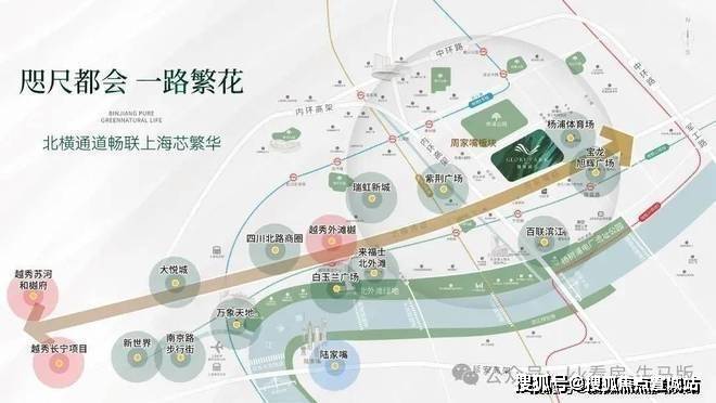 北横通道:继延安路高架后,上海第二条东西向财富积聚中轴线,平行于江河流向,串联虹桥-长风-苏河湾-北外滩-杨浦滨江等上海都心位置