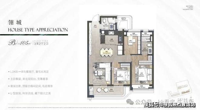 户型信息:建面约 105-143㎡三至四房,如 105㎡3 室 2 厅 2 卫(玄关嵌入式收纳、全明采光)、143㎡4 室 2 厅 2 卫(四开间朝南、L 型双面飘窗),得房率约 82%-88%