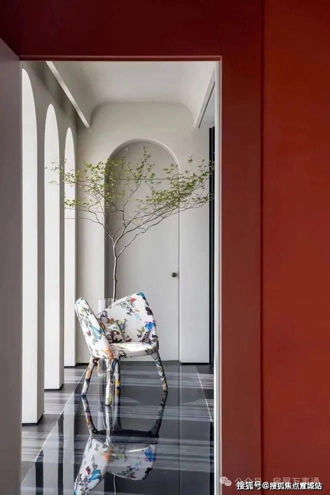 「无界空间」:客厅270度转角无柱设计,搭配落地玻璃,开阔视野将院中风景迎入日常。