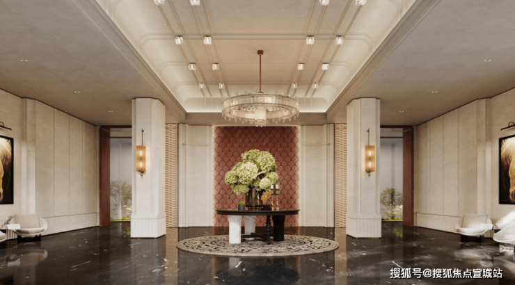 走进大堂与电梯厅,统一的色调与气质也得到了延续。根据我们拿到的方案剧透,首层大堂中,不仅还会出现独立的下沉庭院,还会有供业主使用的私享会客厅。