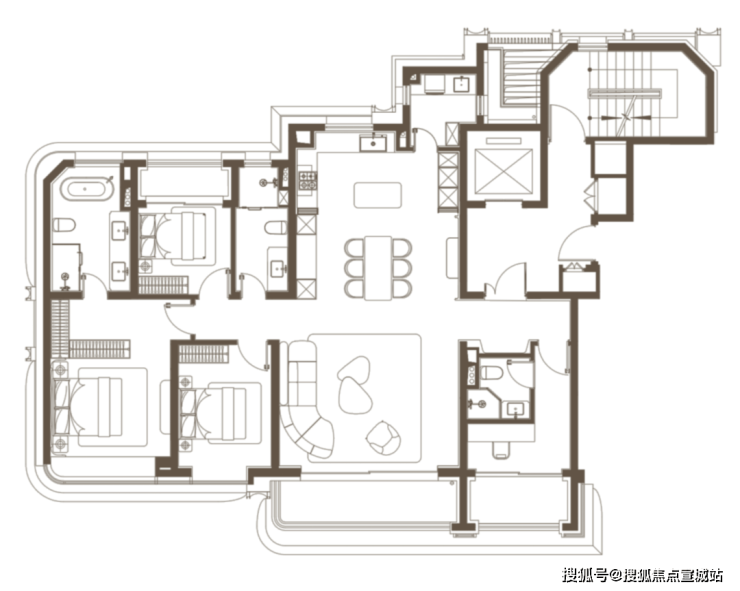 客厅阳台,南次卧阳台,北次卧阳台,三大阳台极大扩展套内空间。这也是新规执行后,最能给购房者带来实际收益的地方。完全扩展后,完全可以 对标老规范中200㎡以上的产品套内体验。