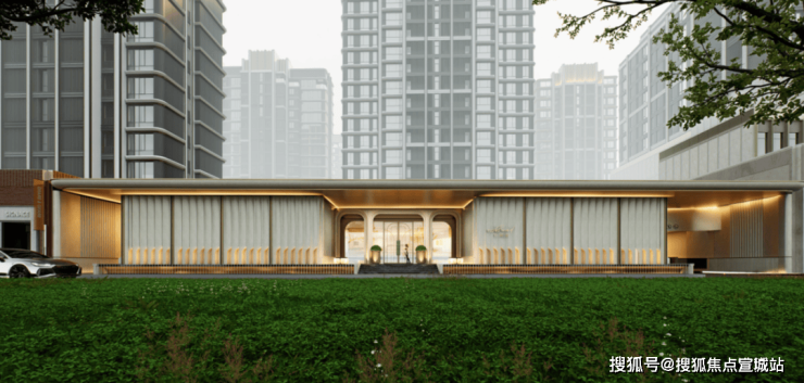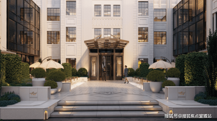 而在主入口之后,正是公区环绕的 下沉会所,以及一侧的景观廊道, 由历史而入门,当代审美在高低错落间,打造了模版级城央体验。