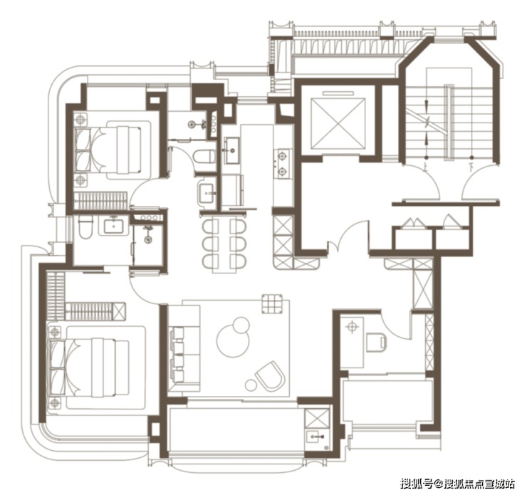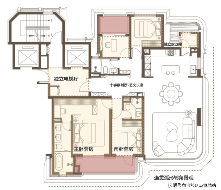 其他空间通过 经典十字序列厅有机组织: 南侧双套房,均有南向阳台。主卧套房升级对标行政套房,衣帽间串联五件套卫浴空间,纵享奢华体验。