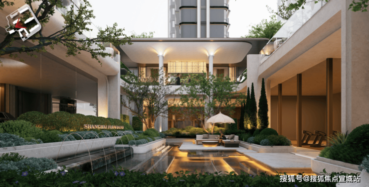 下沉庭院绿意与水系交织,泳池、健身、瑜伽……多种会所功能环绕。地面风雨连廊串联到不同单元入口,而在门前,依然有秘境花园安静等候业主归家。