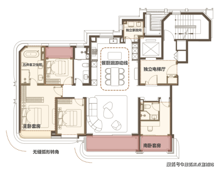 弧形转角阳台、主卧弧形转角窗,不仅是呼应立面设计理念,也柔化了室内空间, 带来更舒适连贯的转角观景体验。