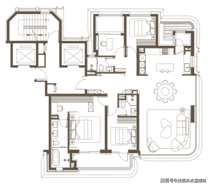 首先来看主力约190㎡户型,分布在两栋单元的西边套。