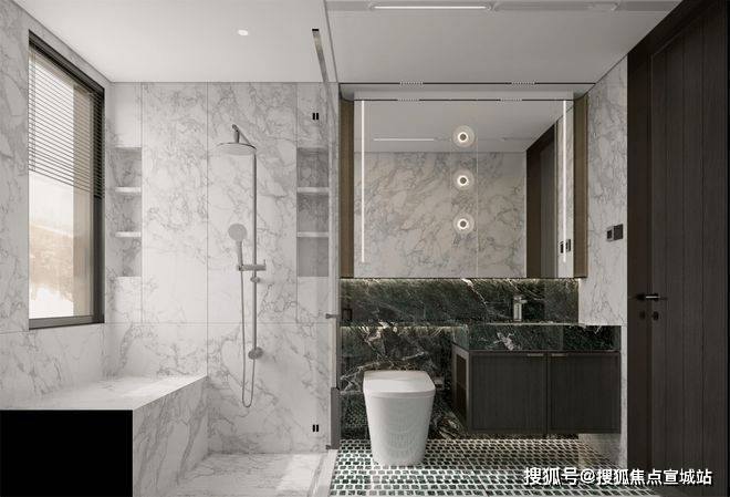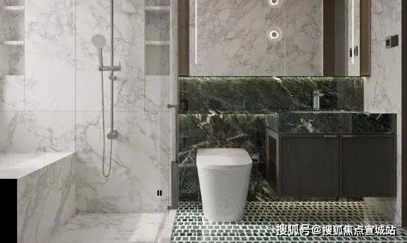 进入卫生间,华润置地观宸润府售楼处电话:400-998-9694 地面墙面几乎全部是奢石包裹,墙面是落地仿汉白玉高级岩板,地面是定制的绿色仿古砖。