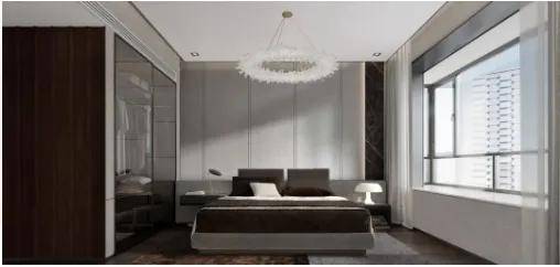 在主卧的打造上是经典的“酒店式”套房设计,在保证私密空间不受打扰的同时,还拥有清晰流畅的动线快速抵达其他功能区。