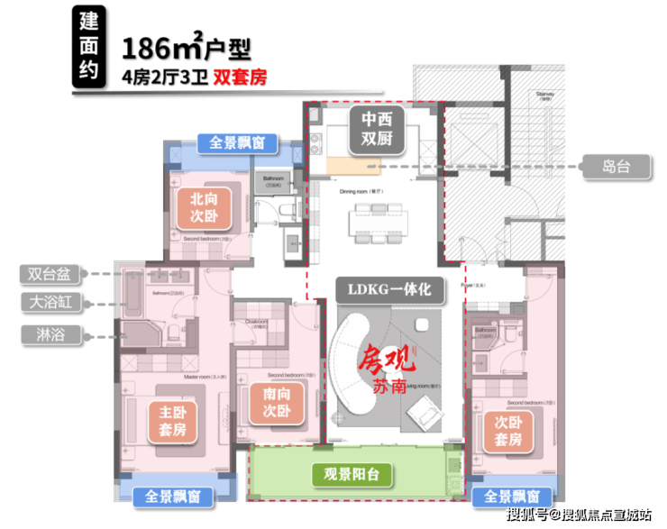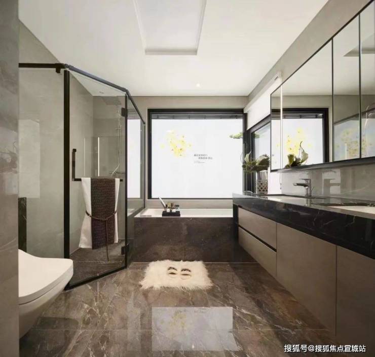 主卫双台盆+淋浴+浴缸,配置270°观景飘窗,仪式感拉满。