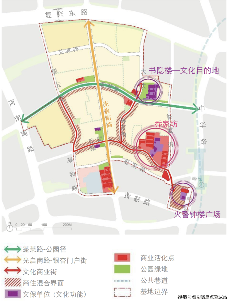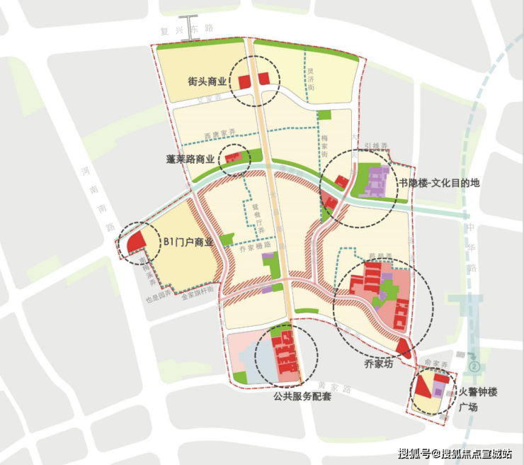 整个乔家路地块由于规模较大,总体方案设计范围:东至中华路,南至黄家路,西至河南南路,北至复兴东路,用地面积约24.11公顷 。